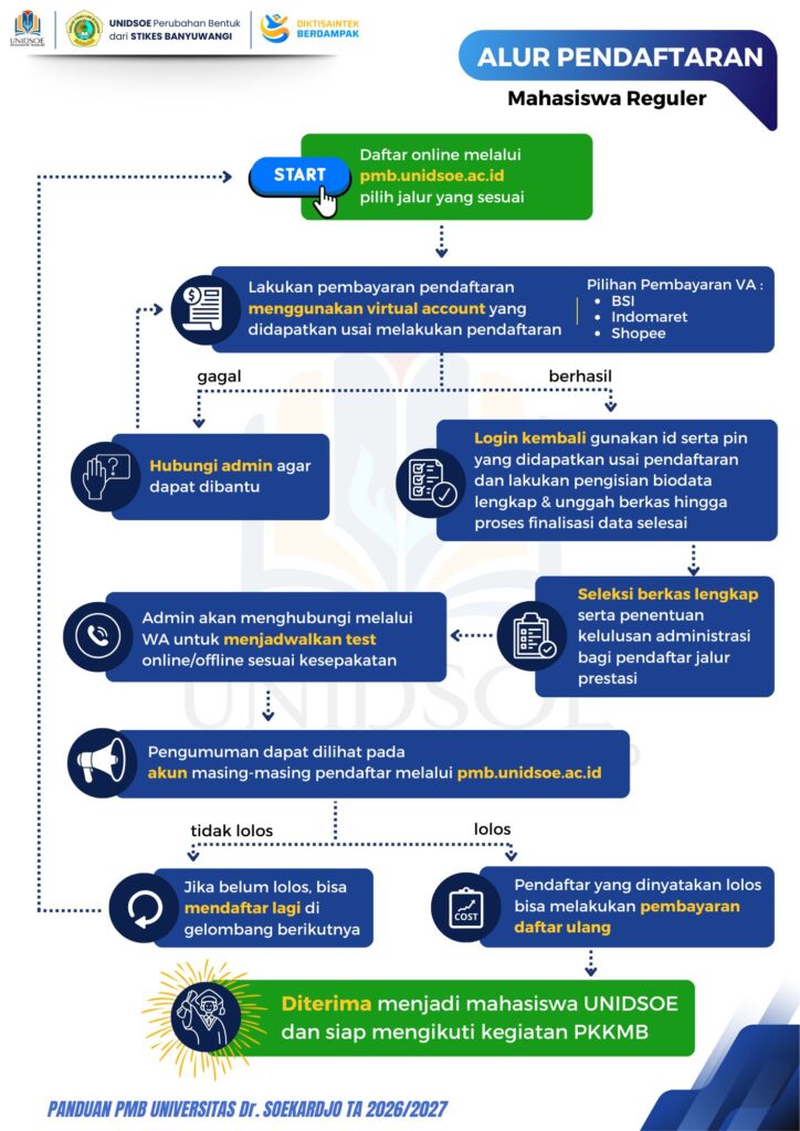 Jalur Reguler dibuka untuk lulusan SMA/SMK/MA dari berbagai jurusan yang ingin melanjutkan studi di Universitas Dr. Soekardjo (UNIDSOE perubahan bentuk dari STIKES Banyuwangi). Pendaftaran dilakukan secara online melalui sistem PMB sesuai tahapan yang telah ditentukan.